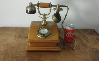 Bonito teléfono de sobremesa vintage de fabricación Italiana realizado en madera con disco de marcación giratorio en el centro. El auricular y micrófono está realizados en baquelita combinado con metal y madera y se apoya sombre un gancho metálico central. Original elemento decorativo, pero no funcional, ideal para decorar su hogar o negocio dándole un toque elegante y distinguido. Dimens: 25cm alto x 25,5cm ancho x 24,5cm fondo. Posibilidad de envíos a toda España previa transferencia bancaria o Bizum. Consulte portes. También posibilidad de recoger en Guitiriz. Disponemos de gran stock de elementos de decoración. Tlf 636 73 66 29