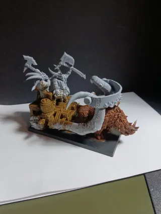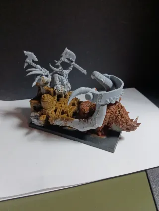 Carro de combate para Hombre Bestia, una pieza de conversión única. - Montado sobre un jabalí. - Figuras de guerreros con hachas. - Detalles de barril y estructura de madera.