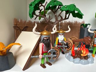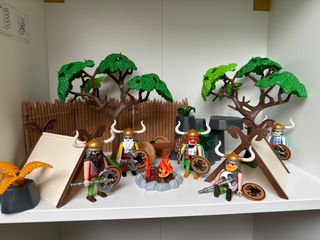 Conjunto de figuras de Playmobil de temática vikinga. Incluye varios personajes con sus accesorios. - Figuras de vikingos con cascos y escudos. - Elementos de campamento como tiendas y hoguera. - Accesorios de batalla como hachas.