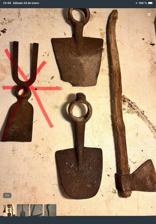 Conjunto de herramientas de labranza antiguas, ideales para coleccionistas o para uso decorativo. - Incluye azada, pala, hacha, guadaña. - Fabricadas en metal y madera.