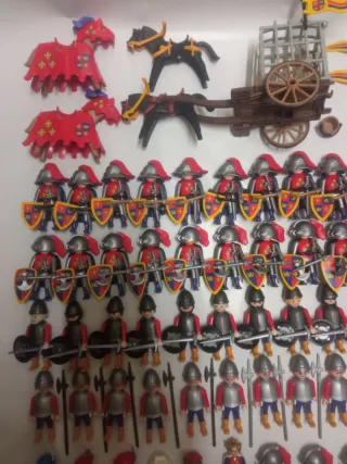 Espectacular Lote de 50 figuras de Playmobil de temática medieval Lys Lis, más muchos extras 10 Soldados con escudo y espada 10 Soldados con alabarda 10 Caballeros con capa, espada, maza y escudo pequeño Lys 10 Caballeros con capa, espada, hacha y escudo grande Lys 3 Caballeros con banderines y escudo grande 1 Rey, 1 reina, 1 niño y 1 niña príncipes 2 Trompeteros 1 bandolero 2 Caballos con armadura roja Lys 5 caballos con adornos 1 Carreta con celda y caballo 3 Lanzas Caballero 6 Banderines 1 Alfombra Oso Formas de pago: Wallapay y Bizum Se hacen envíos: solo Wallapop