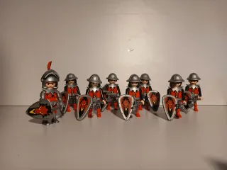 Lote de figuras Playmobil de guerreros con armadura roja y cascos plateados. Cada figura lleva un escudo con diseño de dragón y un hacha. - Incluye 8 figuras. - Armadura roja con detalles negros. - Escudos con diseño de dragón. - Hachas plateadas.