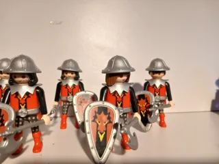 Conjunto de 5 figuras de Playmobil de caballeros de Lys Lis con armadura dorada. - Incluye 5 figuras de caballeros. - Cada figura porta un escudo rojo con detalles dorados de flor de Lys - Se incluyen 2 hachas y 2 lanzas como accesorios.