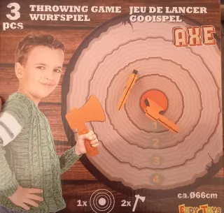 Divertido juego de lanzar hachas para niños. Incluye todo lo necesario para empezar a jugar.3 piezas: - Una diana. - 2 Hachas de gomaespuma - Diámetro del tablero: 66cm