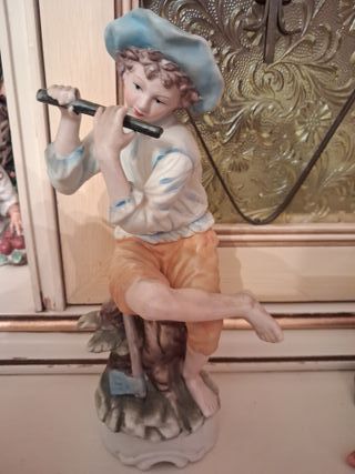 Figura decorativa de porcelana que representa a un niño tocando la flauta y con un hacha a sus pies. - Detalle de vestimenta en tonos azules y naranjas. - Base con elementos naturales como hojas y tronco.