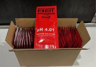 Solución buffer de pH 4.01 de la marca Hach, modelo Singlet. Solución tampón de pH estándar para calibrar electrodos de pH. - 40 Unidades de 20 ml cada una. - pH 4.01 ± 0.02 @ 25 °C.