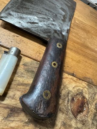 Hacha de carnicero antigua con mango de madera. Gran tamaño - Hoja de metal con signos de uso. - Mango de madera con remaches.