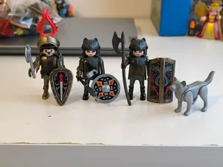 Conjunto de figuras de Playmobil de temática medieval. - Incluye cinco figuras. - Accesorios como espadas, hachas y un estandarte. - Diseños detallados de armaduras y vestimenta. No recibo mensajes de voz. Entrega en mano en Zaragoza.