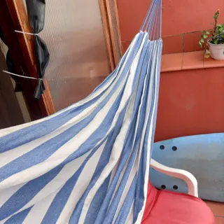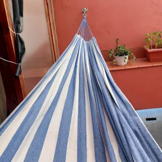 Hamaca de tela con un diseño de rayas azules y blancas. Es cómoda y fácil de colgar. - Tejido resistente y duradero. - Diseño a rayas.