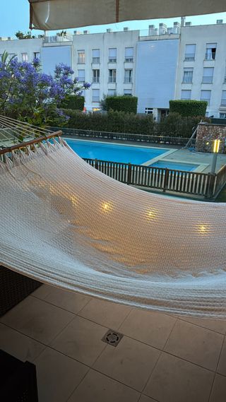 Metro y aparcamiento en el lugar de recogida. Hamaca colgante ideal para crear un rincón acogedor en tu hogar. Perfecta para relajarse y disfrutar de un momento de tranquilidad.Yo la tuve colgada en la terraza , ahora me he mudado... - Diseño con rayas en tonos beige y marrón. - Barra de madera para mayor estabilidad. - Cuerdas resistentes para colgarla de forma segura y protectores en los extremos de la barra que hice, que se pueden quitar.
