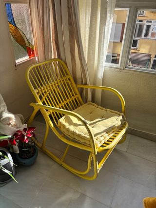 Hamaca de ratán en perfecto estado. Un mueble cómodo y con un diseño llamativo. - Estructura de ratán. - Cojín amarillo incluido.