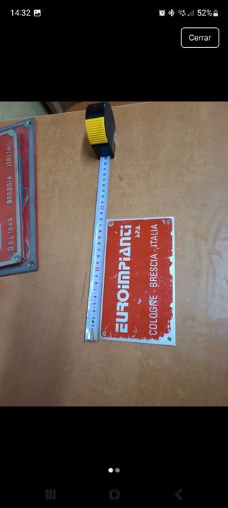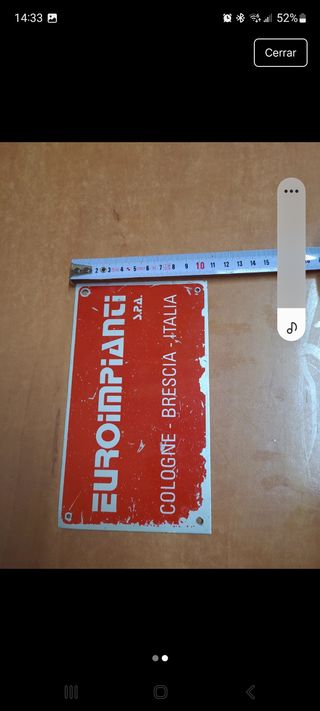 Placa decorativa de metal con el nombre de la empresa. - Diseño vintage. - Texto: EUROIMPIANTI S.P.A. COLOGNE - BRESCIA - ITALIA. - Agujeros para sujeción.