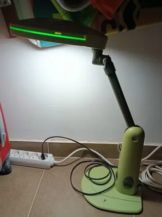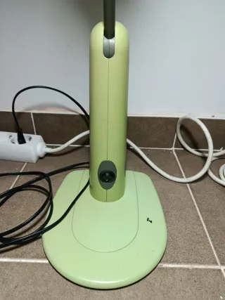 Lámpara de mesa con un diseño moderno y funcional. - Color verde oliva. - Fabricada en plástico resistente. - Brazo articulado para ajustar la luz. Necesita cambiar las luces