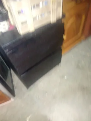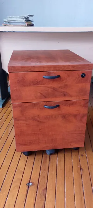 Mesa auxiliar de oficina con un diseño moderno y funcional. Perfecta para organizar tu espacio de trabajo. - Acabado en madera. - Dos cajones con tiradores negros. - Ruedas para fácil movilidad. Precio negociable