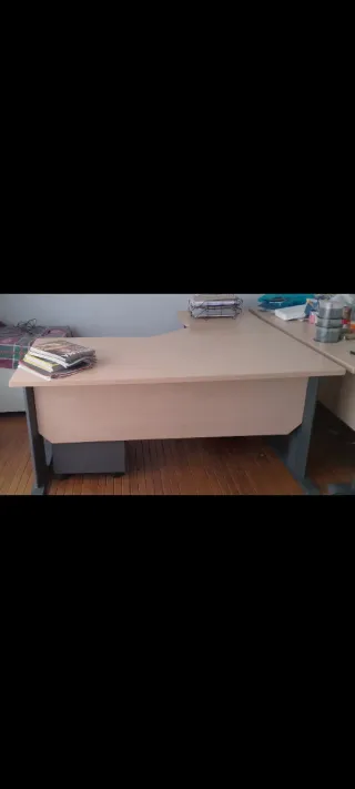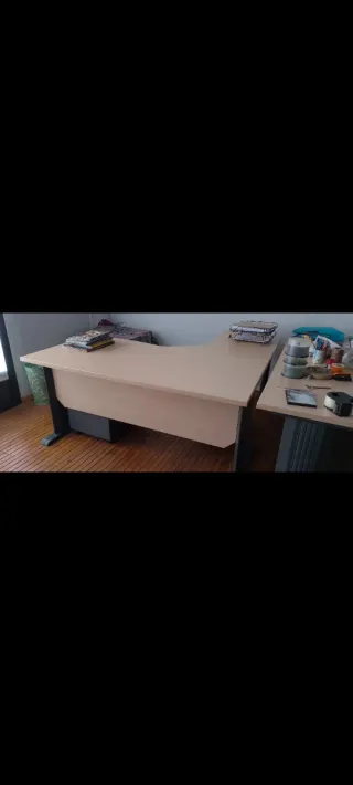Mesa de oficina con un diseño moderno y funcional. - Superficie de madera en tono beige. - Estructura y patas de metal en color gris. - Forma de L para optimizar el espacio. 150 por todo o 120 solo por la mesa. Tengo otra mesa idéntica y otra mesita auxiliar también a la venta.
