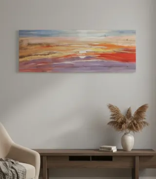 Cuadro Abstracto "Puesta de Sol" – Gran Formato (139x50 cm) Descripción Espectacular cuadro abstracto de gran formato que captura los colores de un atardecer. Es una pieza ideal para colocar sobre un sofá, un aparador o en el cabecero de la cama gracias a su diseño panorámico. Estilo: Moderno / Abstracto con texturas visibles. Colores: Paleta cálida de rojos, naranjas y amarillos que contrastan con tonos violetas y azules suaves. Estado: Nuevo (aún conserva el precinto de plástico protector y las cantoneras de cartón, como se ve en las fotos). Dimensiones: Largo: 139 cm Alto: 50 cm Grosor: 3 cm (bastidor de madera robusto).
