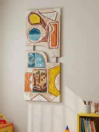 Se trata de una pieza con relieve y texturas, compuesta por dos paneles principales unidos de forma original, creando una silueta moderna y poco convencional. Estilo: Abstracto contemporáneo con elementos geométricos y orgánicos (espirales, soles, formas fluidas). Colores: paleta de ocres, azules, naranjas y amarillos sobre un fondo neutro efecto mármol/piedra. Construcción: Paneles con