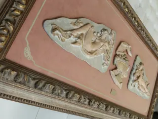 Cuadro Relieve Neoclásico "Pennello" - Gran Formato (112x58 cm), con tres figuras en altorrelieve. El conjunto presenta dos figuras femeninas de inspiración helénica flanqueando un centro de frutas (bodegón). Marco de madera maciza con molduras ornamentadas en relieve y acabado pan de oro envejecido. Firma: Incluye placa metálica frontal con la firma "Pennello".