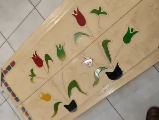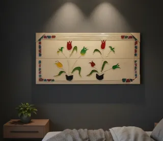 Cuadro Decorativo Floral de Relieve - Estilo Vitral/Étnico (120x60 cm) Elegante cuadro decorativo de gran formato, ideal para dar un toque de color y personalidad a cualquier estancia (salón, dormitorio o pasillo). La pieza presenta un diseño floral estilizado con tulipanes en tonos vibrantes sobre un fondo neutro texturizado. Características Principales: Dimensiones: 120 cm (largo) x 60 cm (alto) x 3,5 cm (grosor). Estilo: Diseño de inspiración artesanal con bordes decorados y detalles en relieve que imitan la técnica del vitral o la cerámica pintada. Colores: Fondo crema/hueso con detalles en rojo, verde.