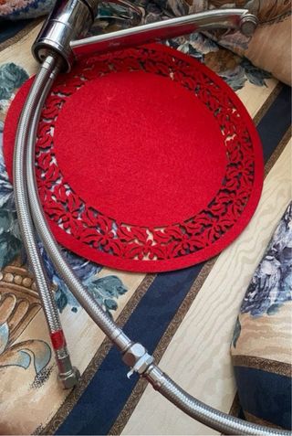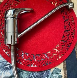 Grifo de cocina con acabado plateado y base de tela roja. - Diseño moderno y elegante. - Manguera flexible incluida.