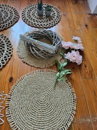 Conjunto de manteles individuales con un diseño floral calado y otros de estilo rústico. - Dos manteles individuales blancos calados. - Dos manteles individuales redondos de yute. - Un centro de mesa o mantel individual de yute con cesta. - Dos plantas artificiales decorativas en macetas.