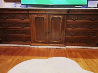 Mueble de salón de madera maciza con detalles tallados y encimera de mármol. Ideal para colocar tu televisión y otros objetos. - Diseño clásico y elegante. - Amplio espacio de almacenamiento con cajones y puertas. - Acabado en madera oscura. - Encimera de mármol veteado. Medida: Largo:224 Alto:85 Fondo:51 Precio negociable Recogida a domicilio