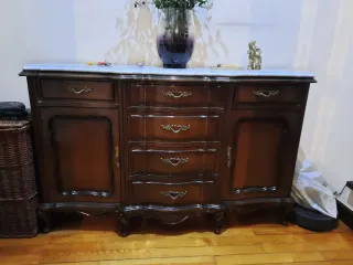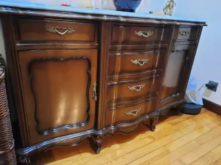 Elegante mueble recibidor con tapa de mármol y estructura de madera. - Diseño clásico con detalles ornamentales. - Cajones y puerta para almacenamiento. - Patas curvas con estilo. - Acabado en tono madera oscura. Precio negociable. Recogida a domicilio
