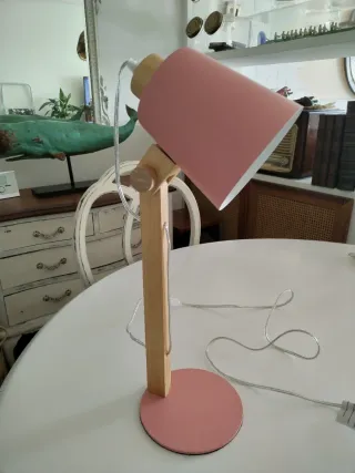 Lámpara de mesa con un diseño moderno y funcional, perfecta para cualquier rincón. Muy buen estado mide de alto 44 cm. Tiene alguna pequeña marca, mirar fotos - Base redonda en color rosa. - Estructura de madera. - Pantalla cónica en color rosa.
