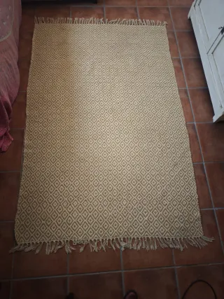 Alfombra con un diseño geométrico de rombos en tonos beige y marrón. Su textura la hace ideal para añadir calidez a cualquier espacio. - Diseño de rombos. - Tejido resistente y natural.