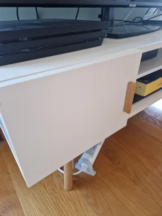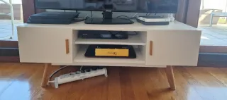 Mueble bajo para TV de la marca SKLUM. Diseño moderno y funcional. Dos compartimentos con puerta para almacenaje - Patas de madera. - Acabado en blanco y detalles en madera.