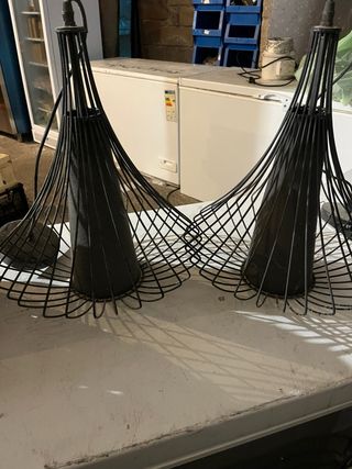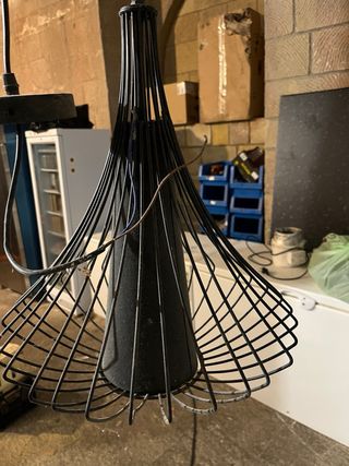 Lámpara colgante con un diseño industrial y moderno. Su estructura de rejilla metálica le da un toque único. - Acabado en negro y detalles plateados. - Portalámparas de metal. Tengo 6