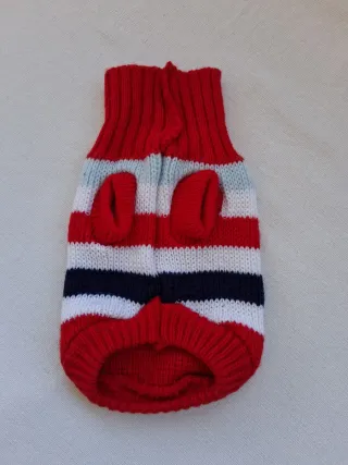 Prenda de punto a rayas para mascotas, ideal para mantenerlos abrigados. Es un jersey nuevo sin estrenar. - Diseño a rayas en colores rojo, blanco, azul marino. - Cuello elástico acanalado. - Medidas en las fotos