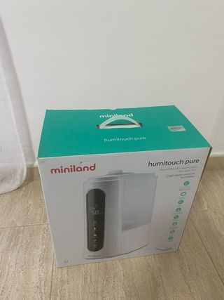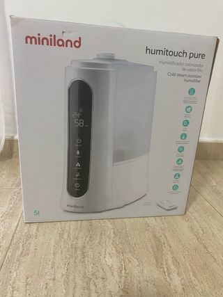 Humidificador Miniland Humitouch Pure en color blanco y gris. Diseñado para crear un ambiente confortable en tu hogar. - Capacidad de 5 litros. - Función ozono. - Panel táctil. - Incluye mando a distancia.