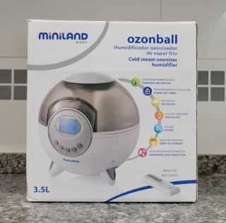 Humidificador ozonizador Miniland Ozonball en color blanco. Capacidad de 3.5L. - Sensor de temperatura. - Temporizador de apagado. - Eficiencia para 25m². - Luz de compañía. - Función ozono. - Gran autonomía de 30h. - Desconexión automática. - Incluye mando a distancia. Como nuevo, apenas uso.