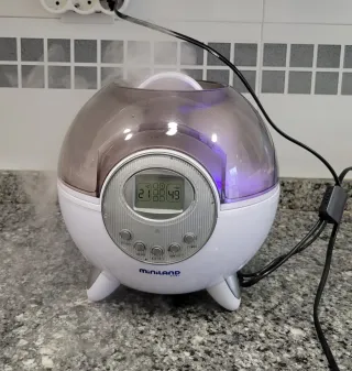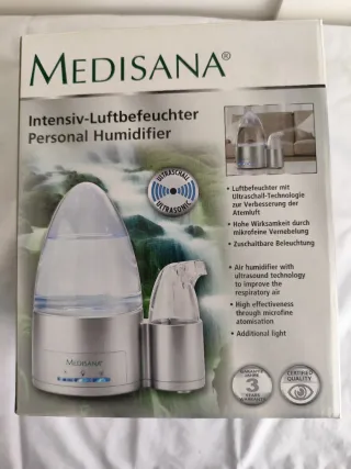 Humidificador Medisana con tecnología ultrasónica para mejorar el aire. - Tecnología ultrasónica para mejorar el aire respiratorio. - Alta efectividad mediante atomización microfina. - Iluminación adicional y conmutable. Tiene un pequeño desperfecto en la boquilla que saca el aire por un golpe, pero no afecta. Simplemente queda la marca ya que se tuvo que pegar para reforzar la zona.
