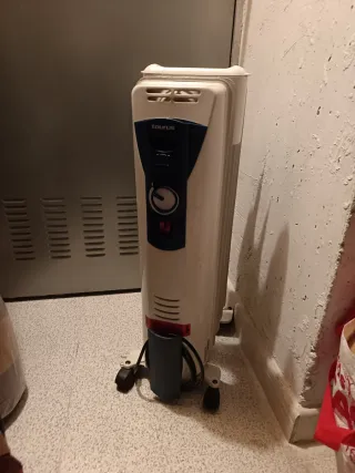 Funciona bien. La tapa del humidificador está un poco rota donde se ancla. (Por eso la cinta de las imágenes). Radiador eléctrico de aceite Ufesa. - Color blanco con detalles en azul. - Fabricado en plástico resistente.