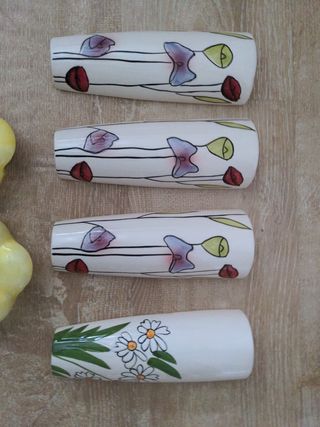 Conjunto de cuatro humidificadores de cerámica para radiador con diseño de tulipanes. Entrega en mano Madrid - Cada humidificador presenta un diseño floral. - Incluye ganchos para colgar fácilmente en el radiador.