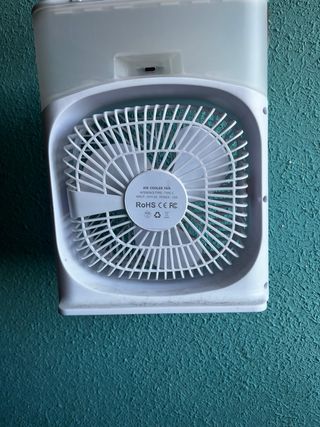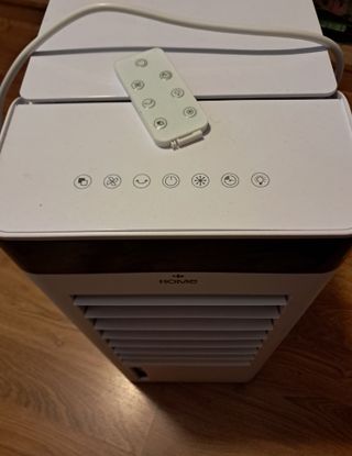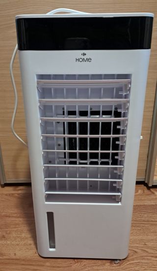 Climatizador y humidificador de la marca HOME. Diseñado en color blanco y negro. Depósito de 7 litros de agua, con un par de placas de hielo. 12 horas programable y con pequeño mando a distancia. Ideal para una pequeña habitación. Usado sólo una vez. No envíos, entrego en mano. - Depósito de agua visible en la parte inferior. - Rejilla frontal con lamas horizontales.
