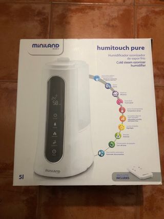 Humidificador ozonizador de vapor frío Miniland Humitouch Pure. - Capacidad de 5 litros. - Autonomía máxima de 35 horas. - Emite ozono. - Eficiencia energética. - Panel táctil. - Sensor de temperatura. - Humedad y flujo de vapor ajustables. - Luz de compañía. - Apto para esencias. - Temporizador de apagado. - Desconexión automática. - Incluye mando a distancia.