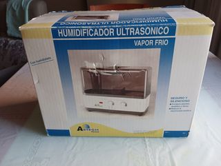Contenido: 1 humidificador 1 higrómetro 1 cable de alimentación 1 folleto de instrucciones Proporciona al ambiente el grado de humedad idóneo. Apto para todo tipo de agua de red. Máxima seguridad con dispositivo eléctrico patentado. Cubeta recubierta para evitar el exceso de calor. Con electrodos de acero inoxidable bañados en titanio. Reducidas dimensiones. Con indicador de nivel y regulador de salida de vapor. Autonomía de 6 a 10 horas. Capacidad dos litros. Con depósito para esencias. Incluye Higrómetro para medir la humedad. Sin estrenar. En su caja y con embalaje original.