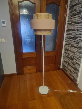 Elegante lámpara de pie con un diseño de capas que combina texturas. - Estructura de ratán y tela. - Base y pie en color blanco.