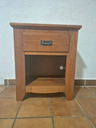 Mesita de noche de madera con un diseño clásico y elegante. - Un cajón superior con tirador metálico. - Espacio abierto debajo del cajón. - Estante inferior. - Acabado en tono madera natural.