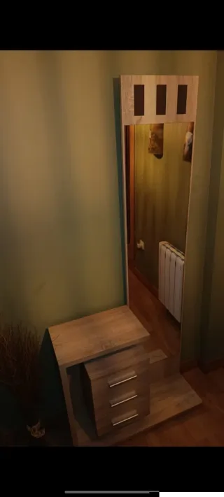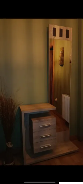 Mueble de entrada con espejo integrado, perfecto para organizar tus pertenencias. - Diseño moderno con acabados en madera. - Espejo de cuerpo entero. - Cajones para almacenamiento.