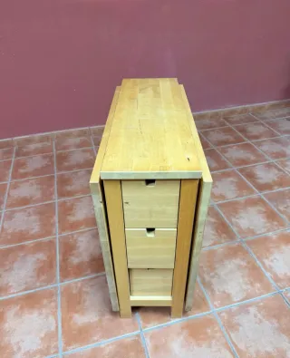 Mesa abatible modelo Norden de Ikea, ideal para espacios reducidos. Su diseño permite plegar los laterales para optimizar el espacio cuando no se utiliza. - Fabricada en madera. - Color beige. - Cuenta con tres cajones integrados para almacenamiento.