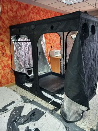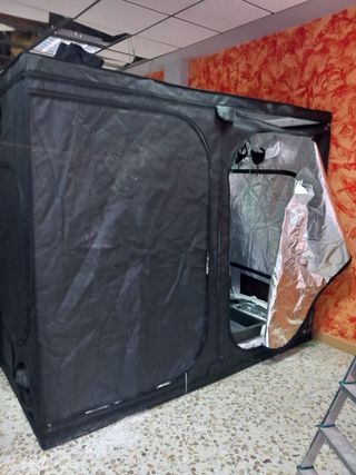 Armario de cultivo para interior, ideal para tus plantas. - Estructura de tela negra. - Interior reflectante plateado. - Bandeja de suelo. - Puertas frontales y laterales.