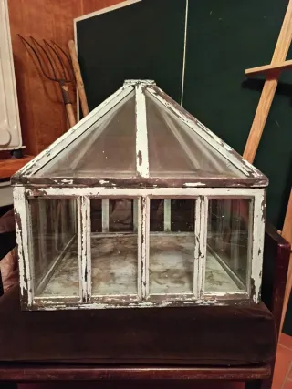 Precioso invernadero de cristal con estructura de madera pintada en blanco, con un estilo vintage. - Estructura de madera. - Paneles de cristal. - Diseño piramidal.