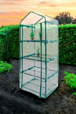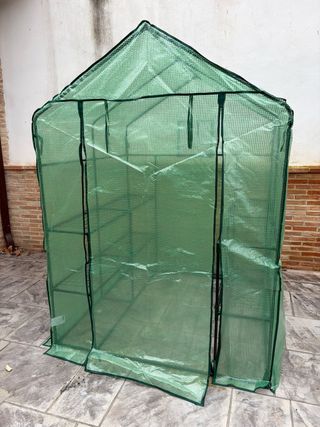 Práctico invernadero para proteger tus plantas. Ideal para balcones o terrazas. - Estructura metálica. - Cubierta de plástico transparente. - Varias estanterías interiores.