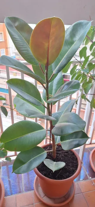 Planta de exterior-interior Ficus Elástica con hojas grandes y brillantes, tiene 6 ramas secundarias, está en un macetón grande, por lo que no hace falta transpantarlo en varios años TODOS MIS FICUS NO SON DE INVERNADERO, POR LO QUE ESTAN ADAPTADOS DESDE PEQUEÑOS AL FRIO Y CALOR EXTERIOR - Hojas de color verde oscuro. - Tronco robusto.