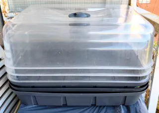 Conjunto de 3 invernaderos de plástico transparente y base negra grandes. - Tapa transparente con ventilación. - Bandejas negras apilables. - en buen estado, poco usados. Precio indicado es por TODAS JUNTAS. Debido al tamaño y delicadeza del plástico no envío, sólo en mano... Plaza Cerdà y alrededores. Revisa otros anuncios que tengo para más accesorios para plantas.