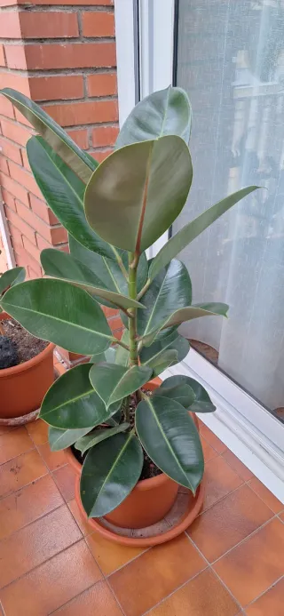 Planta de exterior-interior Ficus Elástica con hojas grandes y brillantes, tiene 6 ramas secundarias, está en un macetón grande, por lo que no hace falta transpantarlo en varios años TODOS MIS FICUS NO SON DE INVERNADERO, POR LO QUE ESTAN ADAPTADOS DESDE PEQUEÑOS AL FRIO Y CALOR EXTERIOR - Hojas de color verde oscuro. - Tronco robusto.